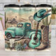 This detailed artwork captures the essence of Western charm, featuring a classic teal vintage pickup truck parked in a dusty desert landscape. A matching acoustic guitar, a stylish turquoise cowboy hat with a feather, and an intricately designed cowboy boot stand prominently. A bull skull, cacti, and a distant barn with a windmill complete this rustic, picturesque scene.