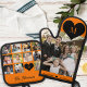 Add 12 family, kids, pets, or best friends photos and create your own trendy collage grid black and orange funny cute kitchen oven mitt and pot holder set with your personal or family monogram name and initial inside white hearts. +++++++++++ Easy to personalise with your custom square images, text and letters. It can be a nice thoughtful keepsake gift for a family member, friend, or coworker on a birthday, anniversary, Christmas, or any other occasion.