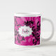 Do you enjoy your coffee by the barrel? Well then, this chic and stylish monogrammed hot pink and black scrolls jumbo 20 ounce mug might be just the thing for you! Add your own name, initial, logo, or text in the spaces provided on the swirled black and white label area, or delete whatever ones you don't want. This would make a fabulous Secret Santa Christmas gift for a co-worker, or friend, or a special birthday gift to the tea or coffee love in your life. If you need help customising anything, email niteowlstudio@gmail.com.