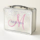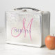 Monogram Pink Script Girl's Silver Pearl Glitter Metal Lunch Box
