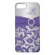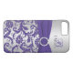 Monogrammed modern purple and silver grey floral damask iPhone 7 case with PRINTED ribbon and PRINTED jewel brooch. it to add your name, initial, or other text. If you need assistance, email niteowlstudio@gmail.com.