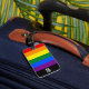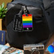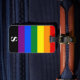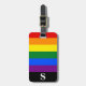 Luggage tag with the lesbian, gay, bisexual, transgender (LGBT) pride rainbow pattern with the colours of red, orange, yellow, green, blue and purple with white monogram on a black stripe. Personalise with your monogram initial, name, and address information using the easy templates. Font colour, font style, and font size are customisable.
