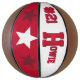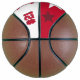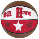 This is a full size basketball with two panels designed with a monogram name (large first letter) and uniform number, in popular college colours. This one is shown in Red, Dark Red, and White. The second panel has team colours with three stars. All text, art, and colours can be removed, or changed as desired. One panel can be left white for autographs, etc.