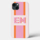 Add a touch of personal flair to your everyday essentials with this custom iPhone case, designed to make a statement. Your monogram takes centre stage, crafted in a bold sans serif font and highlighted with a sophisticated drop shadow effect, bringing depth and dimension to your initials. The retro colour palette, with its nostalgic charm, is accentuated by vibrant pink and orange stripes arranged in a vertical orientation, giving the case a playful yet stylish appeal.