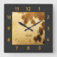 Custom monogrammed square clock with a warm beige brown Texas long horn cowhide animal fur prints background that's ready to be personalised for a loved one. Makes a great gift for a special occasion such as housewarming. Also great for a rustic country western themed home or office decor. The black trim colour may be changed through the colour palette to another colour of your choosing. This beautiful square clock has a non-metallic golden yellow clock face.