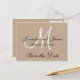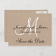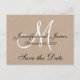 Elegant Monogram Rustic Save the Date postcard. Elke Clarke© for MonogramGallery at Zazzle. Modern, simple wedding announcement with printed beige kraft paper photo effect. A white monogram initial in script typography with black text overlay. Fully customisable. Other colours and background effects available.
