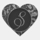 Black and silver Monogram seals on heart shape with a beautiful scrolling script text art on elegant floral damask. These stickers add a unique touch of class to your wedding invitations!