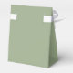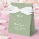 Simple wedding favour boxes featuring a sage green background, your initials, the saying "thank you", your names, and the wedding date.