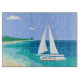 Monogram Sailboat Coastal Tropical Cutting Board. A sailboat with your name on it approaching a beach. Tropical sea view. Blue, teal, sea foam, turquoise, green, white.