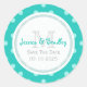 Pretty blueish green polka dot Save The Date Stickers personalised with the couples name and monogram. You are not limited to wedding stickers, you are welcome to change the words and add your own. Create a label for your canned goods,  Gift Tags or any product of your choosing.