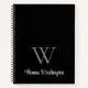 Modern monogram black notebook with your initial in elegant grey typography and your name in a stylish white script.