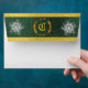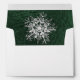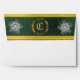 This holiday envelope features a snowflake with gold ribbon trim on a green background. The back flap has a placeholder for the last name initial bordered by leaf monogram frame in silver. This envelope is designed to coordinate with the "Gold Framed Photo & Crystal Snowflake Holiday Card" To change details, click «Personalise». To move the text or change the text size, font, or colour click «Click to customise further».