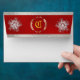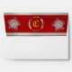This holiday envelope features a snowflake with silver ribbon trim on a red background. The back flap has a placeholder for the last name initial bordered by leaf monogram frame in silver. This envelope is designed to coordinate with the "Silver Framed Photo & Crystal Snowflake Holiday Card" To change details, click «Personalise». To move the text or change the text size, font, or colour click «Click to customise further».