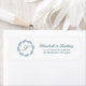 The left-hand side of this wedding invitation return address label features a monogram initial in teal blue surrounded by a line art foliage wreath. Add your names in classic teal script and the address below.