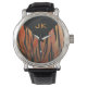Stylish and trendy Black and Hot Orange Tiger Striped Pattern Vintage Leather Watch by Imagine That! Design with our unique touch of texture and pizazz in bright orange colours to satisfy the needs of tiger lovers, wild animal print lovers, and jungle print lovers of all ages. Don't forget to customise the initials to make this your very own. Go wild today with ITD Wild Me Tiger stripes.