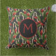 Your monogram on a background of green tropical leaves and red ginger plants on a black and ivory geometric pattern background, these pillows are a beautiful accent to your summer patio. MATCHING items in our store.