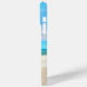 This relaxing tropical beach landscape can be personalised with your name. The image includes two thatched chairs, an umbrella overlooking a cool blue ocean, and a distant island. The blue typography is set in a hand written script font. The text colour, size, and position can be changed in the Edit Menu, if you wish.