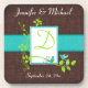 This monogrammed turquoise blue, white, brown FAUX crackle coaster set has a pair of blue lovebirds on a lime green leafy branch that matches the wedding invitation shown below. As a set of six, they would make a nice thank you gift for your wedding party, or break them up into sets of twos, place them in a nice organza pouch, and use them as a wedding favour. They would also make a gift for the newlyweds! Customise it however you want.