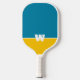 Pickleball purity in two solid colours. Clear mid blue and bright mango yellow. And in white, your initials in a fat serif font. A reduced, minimalist design – strong contrasts, clean lines, truly Zen.