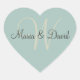 Monogram W Heart Stickers | Envelope Seals Patina Green Heart with Ivory colour monogram and chocolate brown name text. Perfect for the back of your wedding invitation envelopes or sale the date envelopes. You can also apply them to the back of thank you card envelopes and stick them on gifts for holidays and special occasions. These heart stickers are completely customizeable by changing the colour of the heart and text. Add a photo to these heart stickers in place of the background colour for a more personal touch.