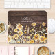 Introducing our Monogram Watercolor Yellow Sunflower Field Wood Mouse Pad . Featuring an elegant watercolor illustration of sunflower meadow with dark brown wood background. Personalise the text and make it your!