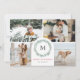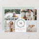 Modern, minimal Christmas photo card featuring 4 photos with a modern watercolor wreath accent, which frames your family monogram or initial. The wording reads Merry Christmas in red, which can be customised to any greeting you'd like. The back of the card features a second personal greeting along with your names.