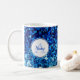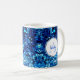 Classic 11 oz coffee mug featuring abstract image of paint strokes in blue shades and white round frames on each side with customisable name and monogram in blue.
