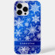 Create a personalised Christmas phone case with a royal blue and white snowflakes pattern. The template makes it easy to type your name.
