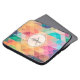 Colourful laptop sleeve features a geometric pattern with triangles and squares in pink, purple, orange, and green with customisable name and monogram in black and grey on semitransparent white round frame. Click on Personalise this template to add your name and monogram. Click on Customise for more options (font style and position) if necessary.