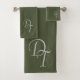Dark green solid colour monogrammed towel set .Now you can easily customise it with the letters of your choice. This colour is also known as chive green . Light grey lettering and basic yet attractive fonts are included. Green is frequently connected with the Virgo and Capricorn zodiac signs. This is something to think about while choosing your colours.