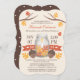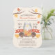 The bride to be has fallen in love! A beautiful fall themed bridal shower invitation with an oak tree branch and golden yellow and orange autumn leaf design with an orange ribbon look banner with white hearts flanking the event year and a mason jar with a lit candle and autumnal leaves at the bottom of the jar. Acorns flank each side of the glass jar and can be monogrammed with the initial and monogram of the bride and groom to be. The back of the invitation is dark brown with a polka heart pattern. Artwork © Chrissy H. Studios, LLC. All rights reserved.