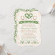St. Patrick's Day themed shamrock couples baby shower invitations with a green heart with white shamrocks inside of it, gold look lucky horseshoes and a customisable banner that announces the upcoming arrival of a wee lass or wee lad. A cream and white parchment antique look background with a subtle damask lace look pattern makes this Irish theme invite pretty and elegant. This vintage modern design is perfect for a March gender neutral baby shower. The back has a diagonal hearts and shamrock pattern. Perfect for the lucky mum and dad expecting a baby boy or girl. This invitation can be monogrammed with the parent's initials and monogram. Artwork © Chrissy H. Studios, LLC. All rights reserved