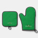 Monogrammed Initial Name Green Oven Mitt & Pot Holder Set. Easily replace the template monogram initial and name with your own. Choose an Oven Mitt and/or Pot Holder. Choose the style from the dropdown menu between silver quilted or black silicon.