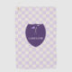 This chequerboard pattern has pale lavender purple and light cream/white colours. In the middle, there is a shield with a pale lavender purple outline. Its background is purple. On the shield, there are drawings one is a golf flag and the other is a golf club. Write your name under the drawings.