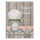 Pretty rustic style monogrammed mason jar binder with a white hydrangea flower and a wooden fence and antique damask pattern lace background and stitched coral pale peach ribbon. This wedding or bridal shower or couples shower guest book and words of advice book can be personalised with the initials and monogram of the bride and groom on the mason jar and customised with the names of the happy couple. Perfect for a country, farmhouse, garden party or barnyard style wedding or shower. Designed by Chrissy H. Studios, LLC. All rights reserved.