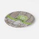 Pretty rustic style monogrammed mason jar paper plate with a fresh green hydrangea flower and a wooden fence and antique damask pattern lace background and stitched green ribbon. This wedding or bridal shower or couples shower, engagement or anniversary party plate personalised with the initials and monogram of the happy couple or bride and groom on the mason jar is perfect for a country, farmhouse, garden party or barnyard style special occasion or celebration. Designed by Chrissy H. Studios, LLC. All rights reserved.