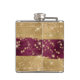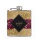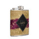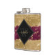 Monogrammed girly fun modern burgundy gold glitter script flask for a personalised gift.