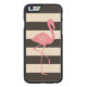 Monogrammed Pink Flamingo + Black + White Stripes Carved Wood iPhone Case