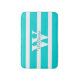 Stylish bath mat, done in a bright teal bold striped pattern. A custom large white one letter monogram, in the middle of the mat, and teal text, is ready to personalise for yourself or as a great gift idea. Comes in three sizes.
