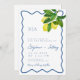 At the top, the couple’s monogrammed initials set a refined tone, followed by the wedding details beautifully arranged within the flowing blue border. The combination of classic typography, fresh lemon accents, and calming blue waves creates a timeless yet cheerful invitation style.