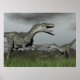 Two monolophosaurus roaring at each other in grassy landscape by cloudy day