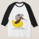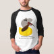 A yellow rubber ducky with a T-Rex head, and a sailboat rudder and tiller in its mouth, says, "Send more campers. The last ones were delicious."