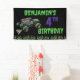 Bright slime-green lettering announces the birthday celebration, while the age is highlighted in bold purple for an eye-catching contrast that stands out against the dark background. A row of glowing green flames stretches along the bottom, adding an edgy monster truck look that fans instantly recognise. The name and age are fully customisable, making it easy to personalise the banner for any birthday celebration. Perfect for monster truck themed parties, this design creates an exciting focal point for party decorations and brings the action-packed spirit of Monster Jam to the event.