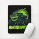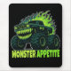 An aggressive and high-impact illustration featuring a dark-themed monster truck with a 'Monster Appetite'. The design showcases a pickup truck transformed into a beast with a menacing toothy grille and skull icons on the side. It is engulfed in vibrant neon green flames that provide a striking contrast against the dark background. The massive, detailed tires and heavy-duty suspension emphasize its power. This artwork is perfect for fans of monster truck rallies, off-roading, and horror-themed automotive graphics. Designed with bold outlines for a premium sticker or apparel look