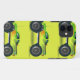 A formidable monster truck, its rugged exterior adorned with vibrant colours and daring decals, roars with an aura of power and excitement against a vivid lime green backdrop, embodying the thrilling spirit of off-road adventure and adrenaline-fuelled triumph. The striking contrast between the bold truck and the lively lime green background creates a dynamic visual spectacle.