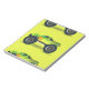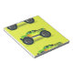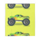 A formidable monster truck, its rugged exterior adorned with vibrant colours and daring decals, roars with an aura of power and excitement against a vivid lime green backdrop, embodying the thrilling spirit of off-road adventure and adrenaline-fuelled triumph. The striking contrast between the bold truck and the lively lime green background creates a dynamic visual spectacle.