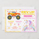 The playful headline “Rev Up Your Engines for a Magical Birthday Party” perfectly blends high-energy monster truck fun with soft unicorn charm. Bright colors, cute details, and a clean, easy-to-read layout make this invitation simple to personalize and perfect for modern family celebrations.