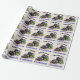 This custom happy birthday wrapping paper features a cool monster trucks theme. A colourful monster truck is pictured in the bottom right corner, and another one is pictured on the left, ripping through the dirt and splashing mud with it's big tires.