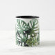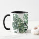 This stylish tropical mug features a sleek white body with a black handle, interior, and rim, Showcasing a vibrant pattern of lush green monstera leaves. Adds a touch of tropical elegance to your daily routine.