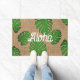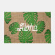 Doormat with green Monstera leaves: Aloha Hawaiian greeting text design using casual script fonts It has a background that looks like burlap, and the text is surrounded by digitally painted tropical green leaves. It has a nice summer feeling. Design by Alma Wad